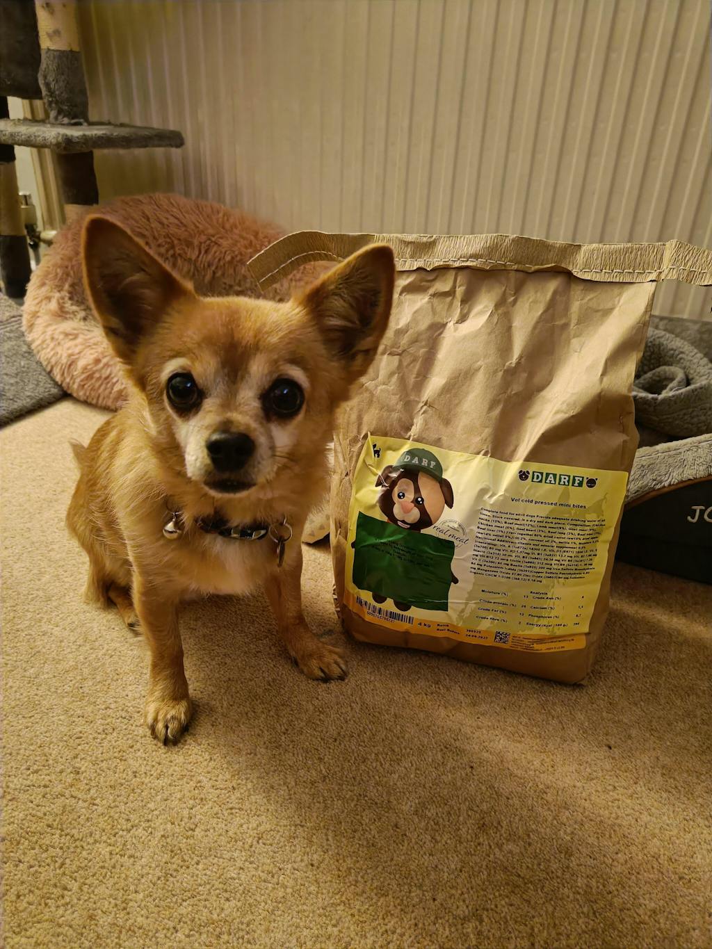 Ingredients: 60% meat (12% chicken necks, 12% beef meat, 9% lamb meat, 9% goat meat, 6% chicken meat, 3% beef heart, 3% beef lung, 3% beef tripe, 3% beef liver), 15% dried carrot, 14% dried apple, 5% millet, 2% krill, 2% coconut oil, 1% nettle